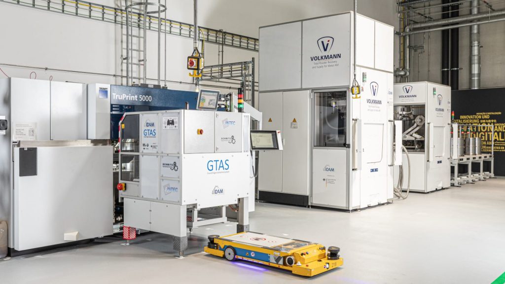 IDAM demonstrator line at BMW AG, from left to right: 3D printer, GTAS transfer module and AGV, VOLKMANN metal powder recycling station, VOLKMANN de-powdering station, and intelligent intermediate storage. Source: BMW AG