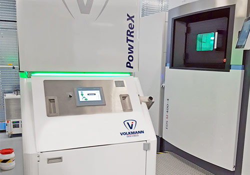 At BMW, Volkmann developed and built a central powder recycling station to prepare excess or unused metal powder for reuse then mix it with virgin powder and return it to the 3D printer. At GKN, a Volkmann PowTReX system performed the metal powder extraction, recycling, and return for printing.