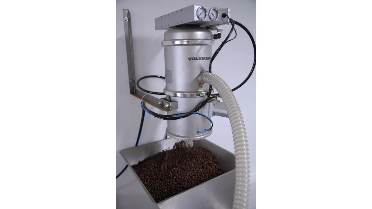 A pneumatic vacuum conveyor transfers coffee beans up and into a hopper for grinding. Volkmann conveying systems use stainless steel as standard to excel in food, pharmaceutical, and other sanitary processes.